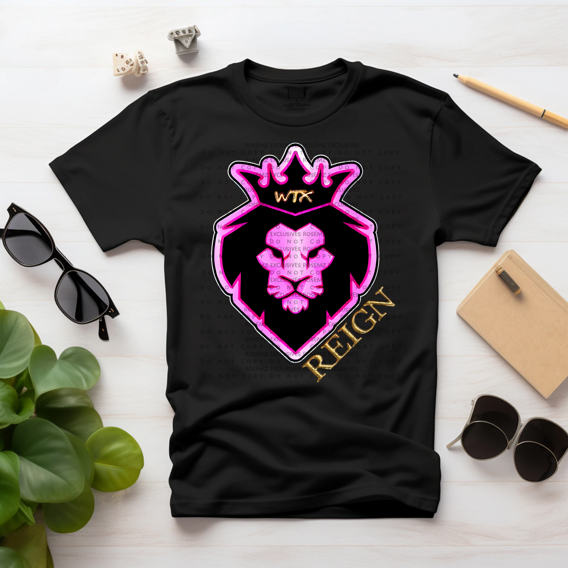 • Design: Pink lion crest with “Reign” in gold lettering