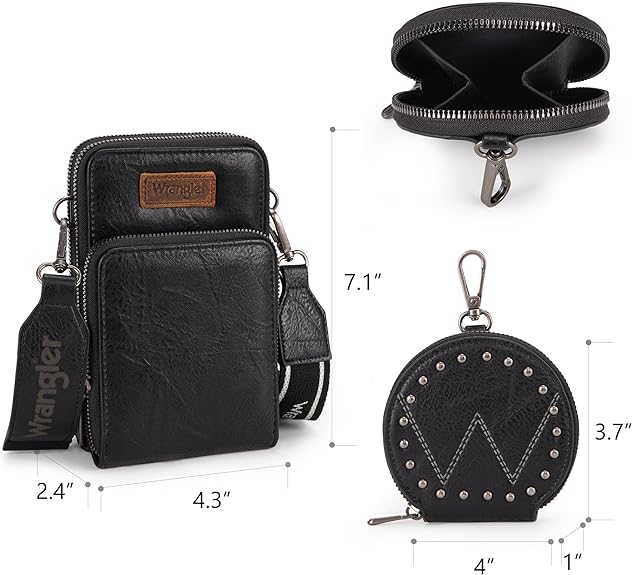 - Phone wallet bag measures: 4.3"(L) x 2.4" (W) x 7.1"(H). Front Pocket: 4.3"(L) x 0.8" (W)x 4.9"(H). Coin Pocket: 4"(L) x 1"(W) x 3.7"(H). Adjustable Strap Drop: 15.7"-26".